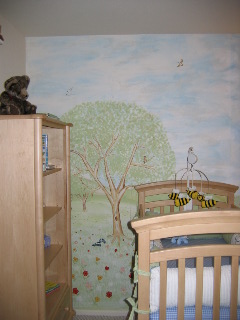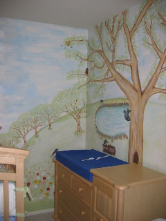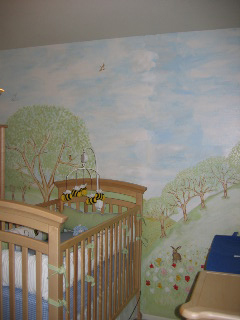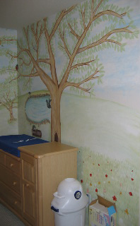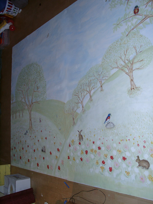 Mural of Hillsides ...bunnies, squirrels, hedgehogs, birds, bees, , flowers, a lot of trees a log and a pond, a tree swing.