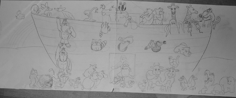 Noah's Ark Mural Sketch - Lion, Dove, Gorillas, Lions, Frogs, Pig, Hippos,