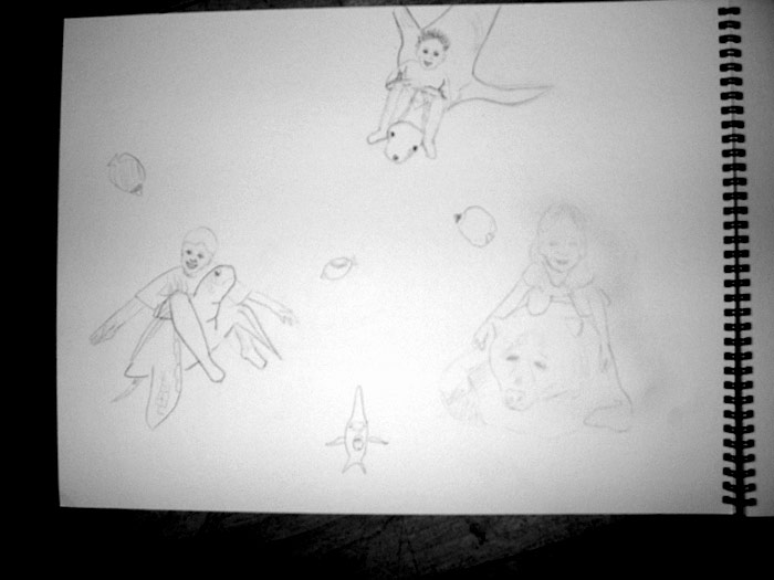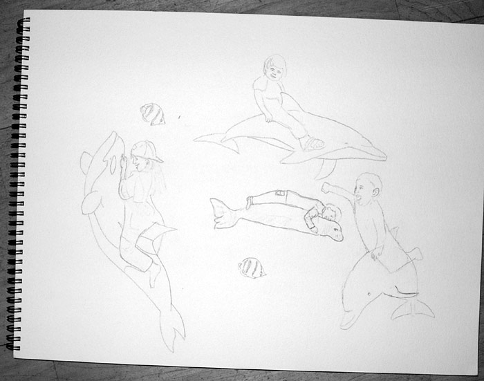 Sketch for a Mural - Sealife Underwater - Kids riding on aquatic animals such