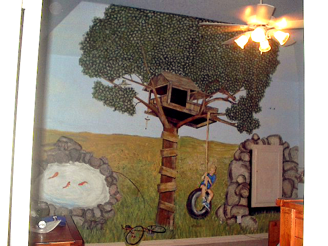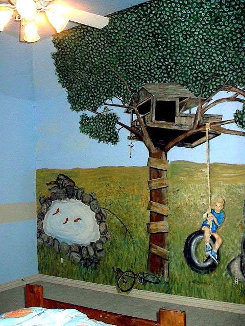 Treehouse mural with Carter on a tree swing. His bicycle is thrown down and