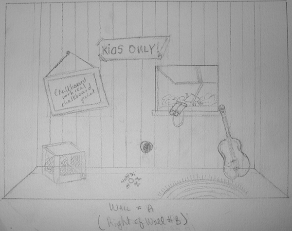 Wall A - Kids only sign. Chalkboard hanging from wall. If you want to, I can