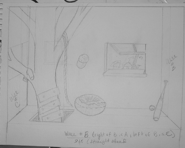 Wall C - Ashley is painting 'Ashley and Jacob's Treehouse'. Fake drawings hanging